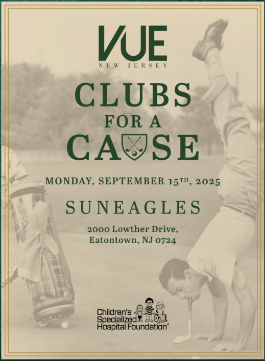 You are cordially invited to join us on Monday, September 15th, 2025, at Sun Eagles in Eatontown, NJ for VUE Magazine’s Annual Clubs for a Cause golf outing. The event raises funding for Children’s Specialized Hospital Foundation.