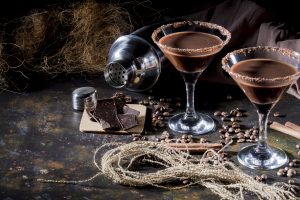 - Dip the rims of 4 martini glasses into the melted chocolate, allowing any excess chocolate to drip back into the bowl.
