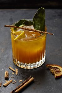 - Pour in the bourbon, lemon juice, maple syrup and a pinch of ground cinnamon.