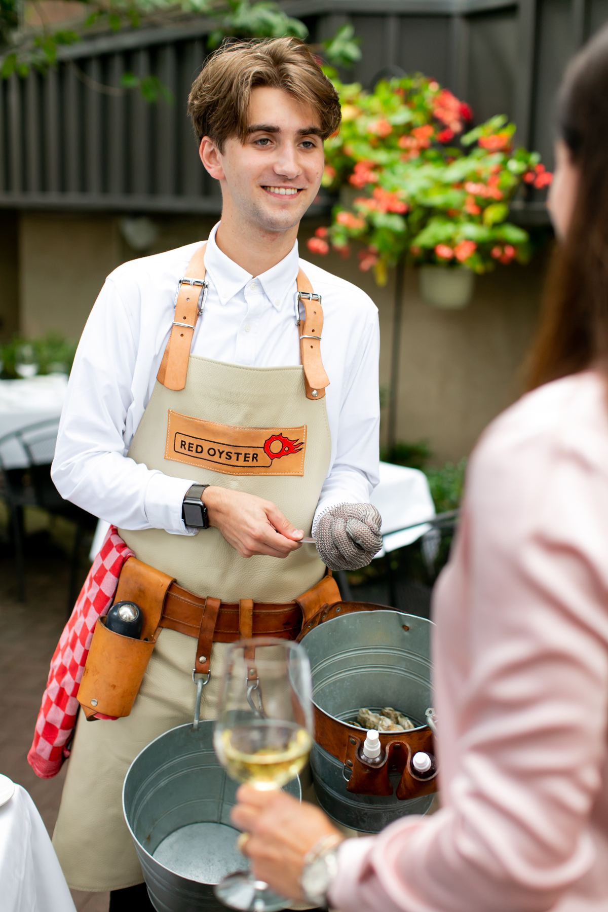 “We come to any event—whether it’s a wedding, corporate gathering, or private party—with our mobile oyster bar and buckets of fresh oysters,” says Angelique. The Oystertainers don’t just stand behind a bar; they roam the event, interacting with guests while shucking oysters right in front of them. This hands-on interaction allows guests to ask questions, learn about oysters, and most importantly, enjoy them in a relaxed, fun atmosphere. There’s always someone who hasn’t tried an oyster before, and often, the Red Oyster often turns hesitant guests into oyster lovers by the end of the night.