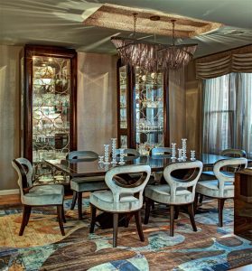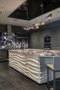 A barn door slides open to offer access to a sprawling pantry and double doors hide a small office complete with desk, file drawers, and shelving. With all clutter behind closed doors, the precious stone counter and backsplash made from agate become the showcase of the room. To further the drama the stone is backlit bouncing light that is reflected off the cracked black glass that covers a pair of cabinets flanking the cooktop and oven. “The owner knew she wanted to use the precious stone but was not sure which one. I brought her to a yard that had the slab she wanted. We knew that it would be the star of the space,” Mannarino said. While this home is the epitome of modern design, Mannarino said she doesn’t stick to a specific style. “It really is all for the client. Some want everything white, some want lots of color. I don’t want to be attached to one style. I’m happy to be appreciated for my past work, but I want whatever the spaces are to fully reflect who the client is and have that recognizable to everyone who sees it. That’s always my goal.