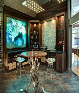 The owners were so thrilled with the results that they hired Mannarino to tackle more spaces, starting with a wine room that sat right off the living room. Originally the space had likely been an office or library, but the owners had started to transform it into a wine room. Mannarino took their idea for the fully refrigerated space a few steps further by adding space for wooden crates to add interest to the walls of wine. Three different types of tiles-carved tile behind the racks, porcelain flooring, and mosaics for the shelving–add visual appeal and keep it from looking too boxy. The tiles are tied together with copper and steel. Strategic lighting, including rom a lighted ledge that spans the wine storage, along with a panel that features an underwater scene, gives the feeling of being inside an underwater cave.