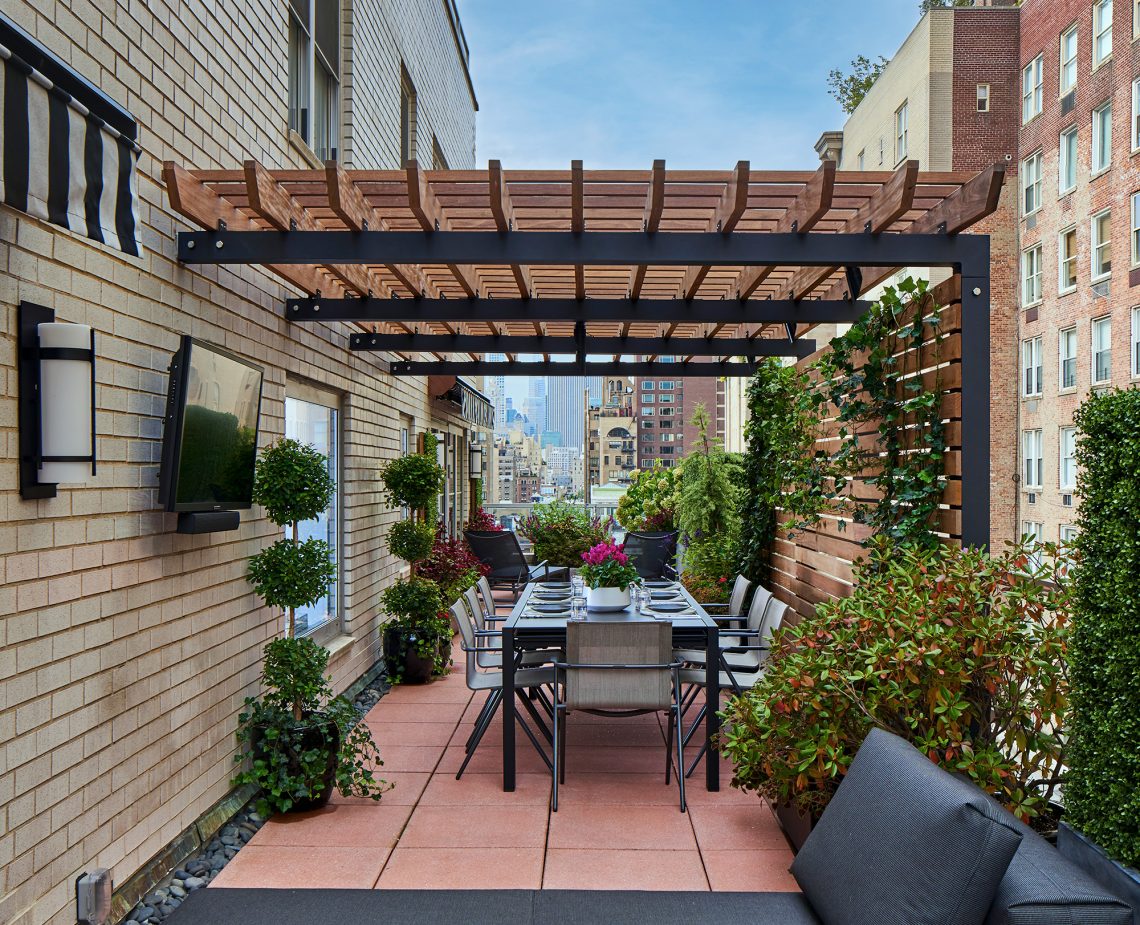 Directly across from the blue room is the crown jewel of this apartment, the outdoor terrace. Prior to the remodel, the owners never really used the terrace and wanted to seize this opportunity to give it a much-needed facelift. The landscaping was designed by Plant Specialists and includes the addition of thick hedges along the perimeter of the terrace to help offer some privacy along with florals to add pops of color and interesting blooms during the warmer months. All of the outdoor furniture was carefully selected by the designer and provided the clients with newfound options to dine, lounge, and entertain. The trellis above the outdoor dining area helps add shade and another layer of privacy.