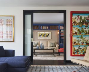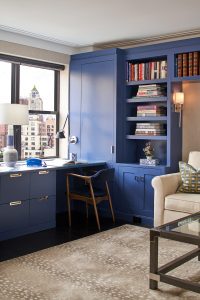 West of the living room is what is referred to as “the blue room,” or more officially known as the library. A custom wall-to-wall shelving unit with blue lacquered paint gives the room its name. The shelving extends onto an adjacent wall creating a desk with extra office storage. Lauren mentions that this vibrant pop of color adds excitement to what is mostly a calm, neutral space and complements the darker navy textiles found in the formal living room. The blue room mainly serves as a study, sitting area, and home office.