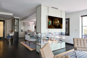 This layout created a kitchen-dining-living formation that gives the space a harmonious yet structured flow. In the center of the entire room is a see-through glass fireplace that can be admired from any vantage point of the apartment. The use of the cabinetry and fireplace gives the space a sense of organization and alignment without making it appear cluttered, dark, and divided. Lauren Fanizzi, in charge of interior design, selected neutral textiles in shades of pastel blue, navy blue, beige, grey, and white. These fabric and leather materials were woven onto custom furniture that evokes a relaxing ambiance while still retaining functionality.
