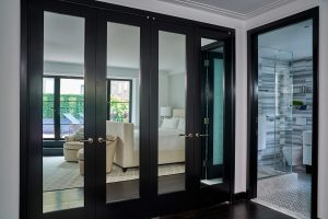 Transitioning into the master bedroom, the first words that come to mind are minimal, effortless, and unfussy. A custom closet was built to accommodate the client’s storage needs. Previous white accordion closet doors were replaced with black french doors that feature exterior, full-body mirrors in order to reflect the landscaping on the terrace. This makes the room feel larger, adds brightness, and offers the illusion of being in instead of an Upper East Side apartment in the sky.