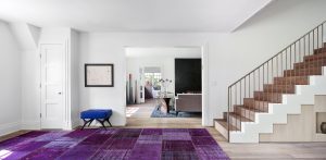 Another aspect of this home that contributes to a holistic lifestyle is Grochowski’s complex use of color. The rooms range from having clean backgrounds with the only hint of color coming from accessories to possessing a vibrant purple rug or artwork flecked with every color of the rainbow. Grochowski describes this juxtaposition by saying “when you’re trying to create a sense of calm with color, it’s not overdoing the color—it’s the balance between the neutral and the use of the color.” She also recognizes the comfort in familiarity; much like how RHG A+D used metal as a common material from room to room, the color purple can be seen in nearly every room of the house, inspired by the outstanding rug in the foyer. The downstairs theater has a light purple sofa, the master bathroom chair has a rich hue to it, and even the flower bouquets, despite the variety in their backgrounds, show the shade’s versatility. However, Grochowski ensures the color is not overdone; she says that by threading a specific color throughout a house, “it’s having the color with some restraint, and then also finding the places that you want to have fun.” One of the prominent elements that supports Grochowski’s vision is the steel and smart glass wall at the back of the house. It floods the indoor living space with natural light and views of the lush backyard, which is multi-colored all seasons of the year. Here, the ideal connection between indoors and out is exemplified. To Grochowski, “engaging with outdoor space is an inherent reminder of universal connection and that supports peace and wellness.”