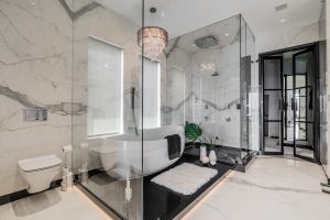 Much like the imperceptibly textured wall, DeLeon designed the second-floor master bedroom with features that would not be visible upon first glance. She already considers the master bedroom beautiful with its double door and gray upholstered wall, but a “really cool” feature to her is the entire one-sided wall made out of dark black glass, with hidden doors that go into closets. One of the closets is an extension of the secondfloor bathroom: a marble suite with a chandelier above the tub, and two glass doors outlined in black to give the room a classy feel.