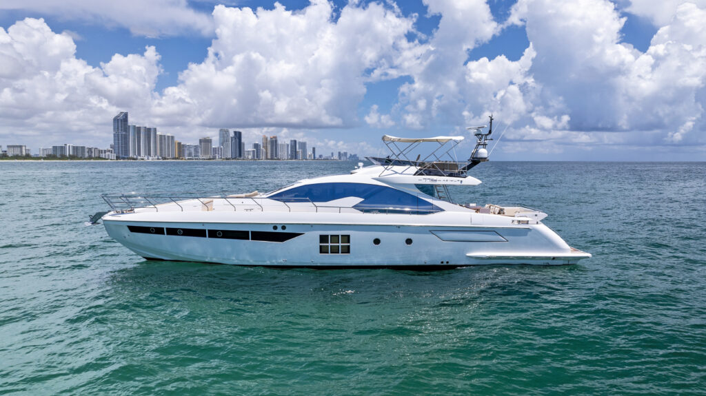 For those looking for elegance and a smooth experience on the water, the ’50 Azimut Flybridge allows for elite performance with a luxury design. Notable features of the yacht include a spacious bow seating area and an open-air upper flybridge with extensive seating perfect for sunbathing, and a wet bar. The interior of the vessel possesses a modern design with large windows for optimal sunlight and breathtaking views of the sea. Additionally, the salon allows for socializing and tranquility with comfortable seating, a dining area, and an entertainment system. This yacht can accommodate up to six overnight guests in the master suite, the VIP cabin, and the twin cabin each with an ensuite bathroom. Moreover, members can enjoy the stunning waters off the boat when anchored out by the onboard tender.