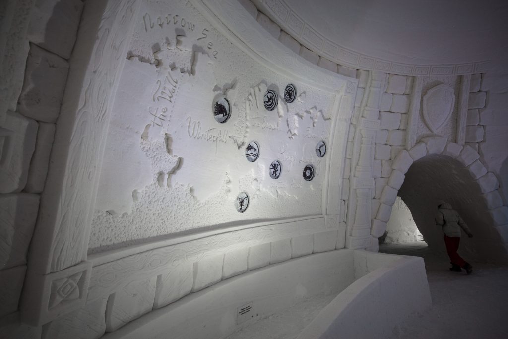 The project summoned the help of professional ice sculptors who recreated iconic show-related characters, places and symbols. In one suite you can sleep under House Tully’s silver trout sigil and in another, a White Walker with glowing eyes to match. There’s also an icy map of the Five Kingdoms to help you get around, an impressive carving of the Braavosi Hall of Faces, and at the entrance, The Iron Throne (made of ice) with a figure of The Mountain standing guard.