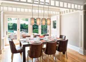 To accomplish this goal, Watty and her team utilized a paint palette made up of every shade of grey. Jennifer Watty said, “Some of the greys are green, some are blue, some are darker, and that’s one of the things that makes the job look so serene”. Another defining feature of the house is its architecture. The house was originally a Tudor, which could be seen in some of the woodwork in the front entry and the ceiling of the living room. Watty brought the Tudor into today’s world by incorporating contemporary furniture, modern lighting, and the aforementioned soothing paint palette to transform it into a transitional style. Watty said the transitional style of the house gives it a “peaceful, Zen vibe”, which is only heightened by the deliberate fabrics of the furniture. For example, every curtain in the house is white sheer linen, and to Watty, this kind of repetition means “strength and balance. . . it just makes you feel good”.