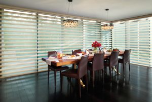 The Pirouette shades offer a fusion of the Roman and Silhouette shades. They allow the ability to look out with full room darkening and elegantly fold like a Roman shade.