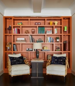 A stunning component of this apartment is the grand, burnt-orange custom bookcase. Organically-shaped, rattan Palecek chairs add an accentuating dimension beneath the bookcase. Moving into the dining room, modern Cliff Young chairs encompass a rich, dark wood table from Bright Group, which features pieces of glass inlaid in areas of the table. A stunning Ochre chandelier dangles over the table, providing a divine focal point for the room.