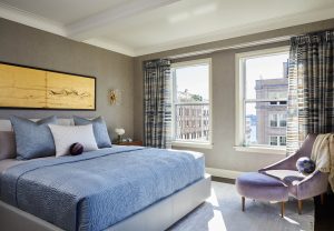 In the master bedroom, the water can be seen from the large windows so Cynthia wanted to utilize the windows as a way to open-up the space and allow the natural light to thrive. The Kravet Couture window treatments sit as panels to constantly allow the light to flood in and motorized shades were added for when the clients want that extra privacy. The combination of blue and gray hues with a splash of shimmery silver adds a level of sophistication to the space, and is warmed-up with walnut side tables. Vintage 1960s Murano glass sconces, by Venini, flank the bed and add an elegantly rustic touch. A plush, soft palleted area rug is complemented with a punch of color from the dusty purple Lepere chair. The room is completed with a custom pillow the client made herself out of pieces of old ties.