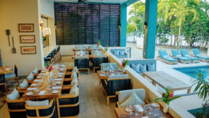 Prana Maya – Grill overlooking pool banquettes and chaise lounges
