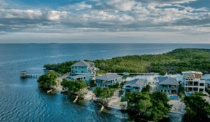 Prana Maya Island Resort – Inn (top) and Villas, Caribbean Sea (left), lagoon (right)