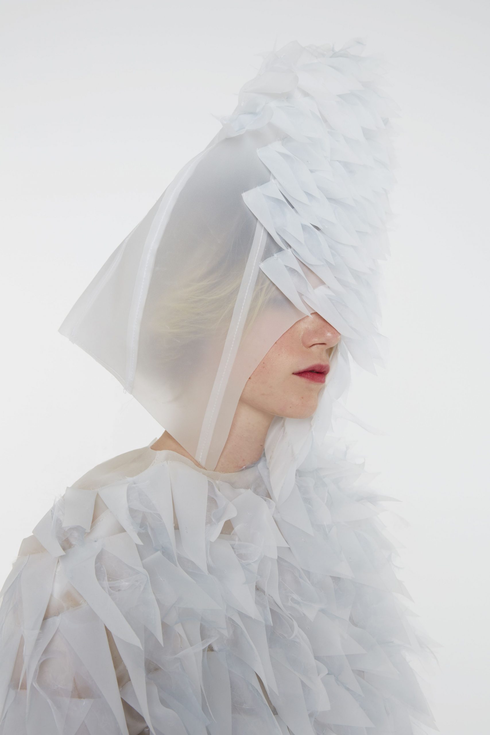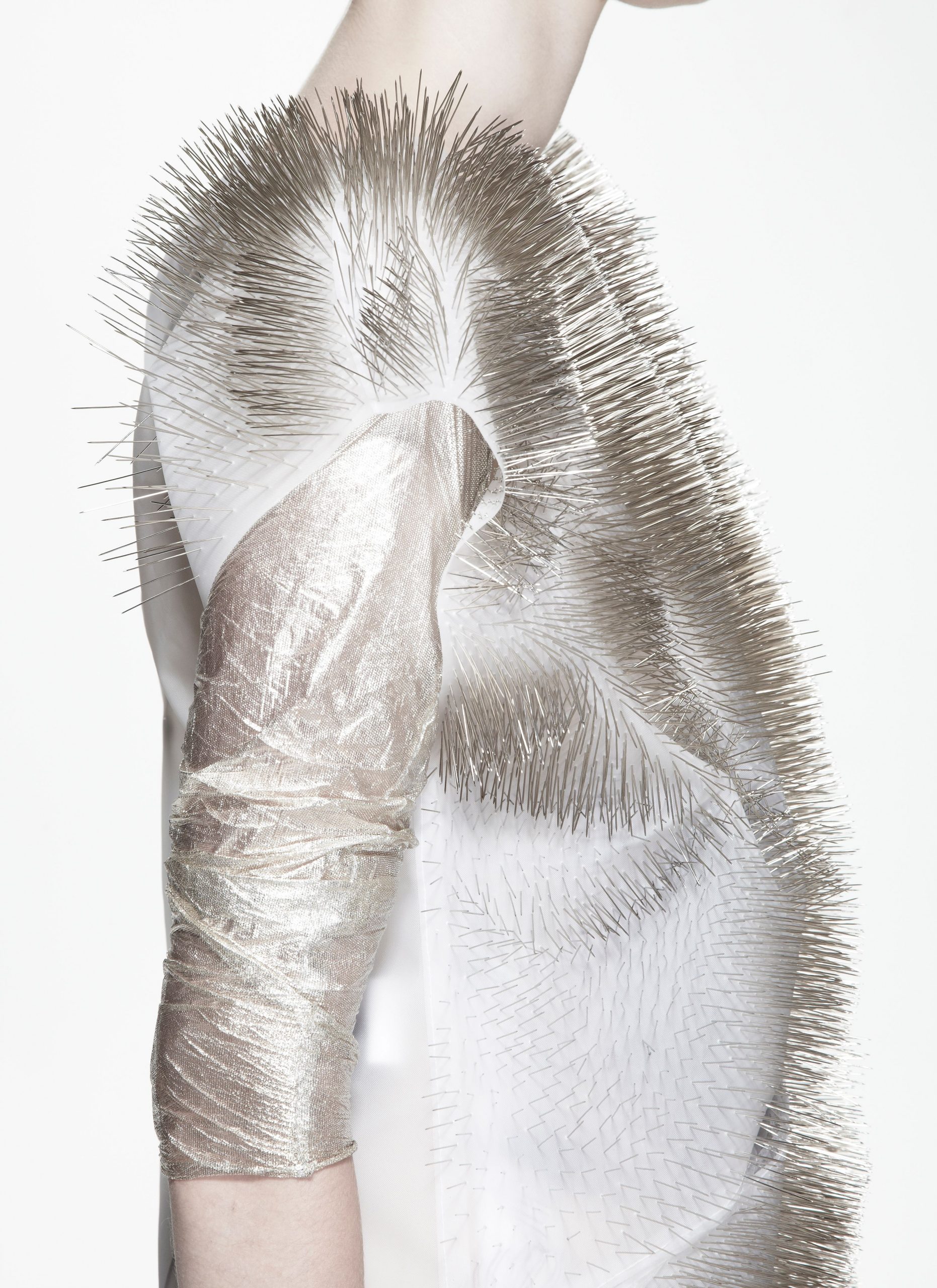 Her inspirations for this work were that of the sound that dressmaker pins create when moving– reproducing a sort of subtle, inexplicable dialogue between the creative process and the final result. She also refers to Hussein Chalayan, a fashion designer with interactive clothing dating back to the early 2000s, as an inspiration for “Incertitude” and her view of fashion as a whole.