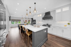 Among all the spaces in the home, the most notable is the 700 SF kitchen. For every chef in the house, the kitchen is furnished with two dishwashers, double sinks, a beverage fridge, a subzero refrigerator, a built-in Miele coffee station, and a grand six-burner Viking gas stove. This incredible room is lined with inset cabinetry, under cabinet lighting, and wide plank tile heated flooring. Ten-foot long double islands topped with solid quartz countertops comfortably seat 12 people.